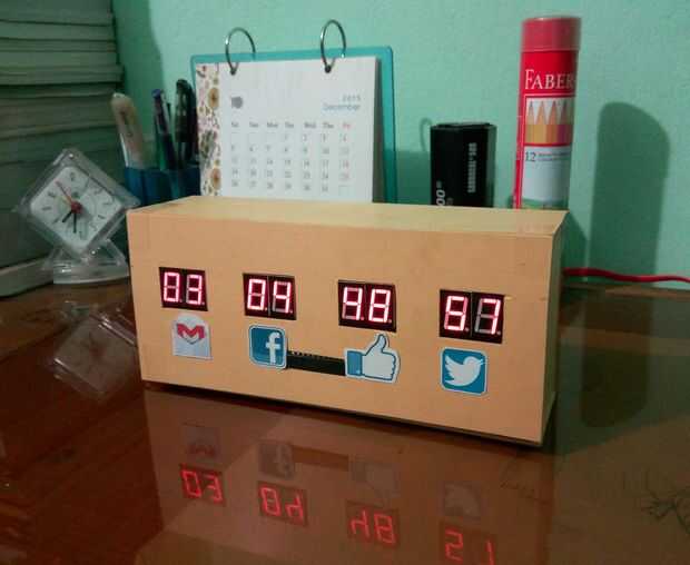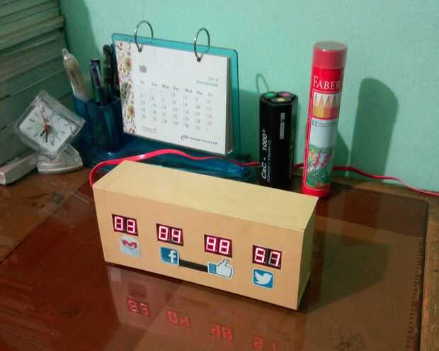 Estaba pensando hacer un notificador de escritorio que me notificará sobre mi nuevo correo electrónico, notificación de Facebook y Twitter y finalmente lo hicieron. Usé el ordenador monoplaca más frambuesa Pi para llevar la cosa en realidad. Este notificador de escritorio le notifique acerca de Gmail nuevas, notificación de Facebook y mostrar el número total de nuevos correos electrónicos, total número de talla de su cuenta de Facebook la página, número total de notificaciones de tu cuenta de Facebook y el número de tus seguidores de Twitter. Usted puede modificar fácilmente para mostrar información como el número de tweets, número de peticiones de amigo, número de mensajes etc. a otros. Usé sólo dos siete segmento para cada información mostrar y para ello puede mostrar 99 notificaciones máximo. Se puede fácilmente extender si quieres.
