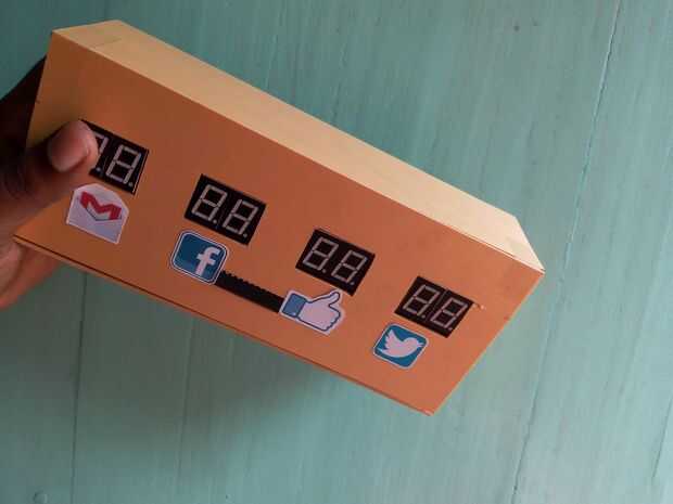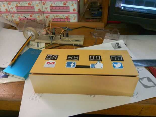 Ahora fije la parte superior junto con el circuito a la caja incluida con Raspberry Pi. Ejecute el programa de python se une con el siguiente paso. El notificador le notificará acerca de su nuevo correo electrónico no leído, las notificaciones de Facebook, total como tu página de Facebook, Total de seguidores de su cuenta de Twitter. Usted puede modificar fácilmente el programa para mostrar a otros información como solicitudes de amigo, total no leídos Facebook mensaje etc. Incluso se puede utilizar para mostrar la hora y fecha como usar como un reloj de escritorio.