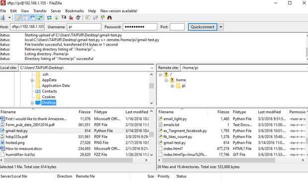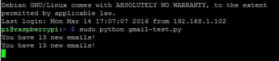 Copie el código en un archivo gmail-test.py o descargar el código directamente desde el enlace de más abajo. Transferir el archivo al directorio casero de frambuesa Pi usando el FileZilla y ejecute el comando siguiente desde la terminal: