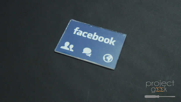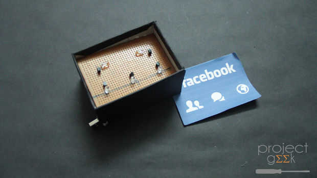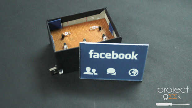 La electrónica en el recinto la caja hecha del cardboad del lugar. Imprimir la imagen de facebook en una hoja de papel y pegarla al cristal. Coloque el vaso encima de la caja.