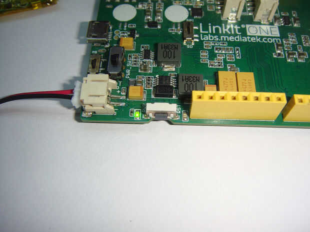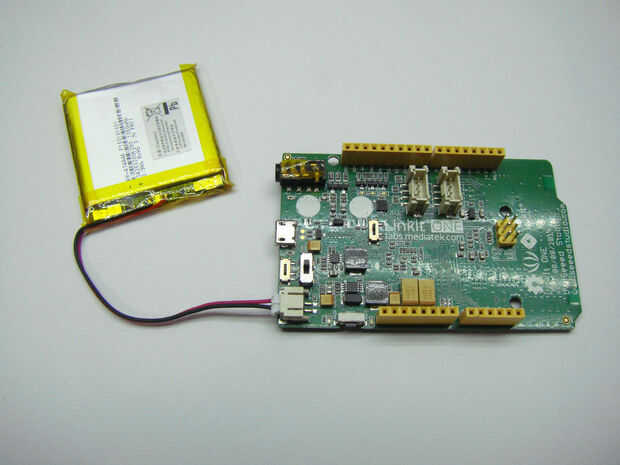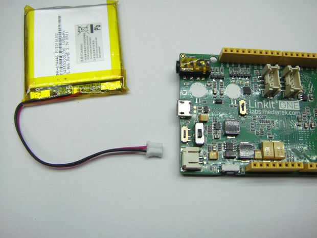viene con un 3.7V 1050mah li-ion batería. Sólo recoger la batería y conecte la batería en el conector en la un placa linkit en lado izquierdo. Irá dentro de una única manera. Compruebe su batería nivel Estado o potencia de la batería van en la carpeta de ejemplos de su ide de arduino y subir "LBattery" código a la placa y abrir el monitor serie. Su nivel de batería se mostrará allí.