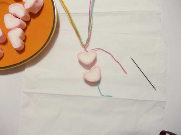 2. Utilice el otro extremo de la pequeña hilo/cuerda para garantizar los caramelos en el lugar. Un nudo en el extremo de cada dulce, antes de prender otro caramelo. Esto es para asegurarse de que la costumbre de caramelo suave caer fácilmente.