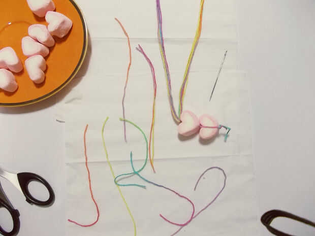 3. Haga un nudo en el extremo de un caramelo antes de prender otro caramelo a un pequeño hilo