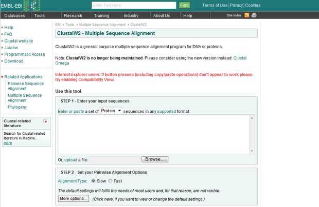 Hay muchos programas ClustalW en todo el mundo pero son más o menos lo mismo. Con el propósito de demostración, se selecciona el servidor europeo (EMBL-EBI). Versiones fuera de línea están disponibles para descargar en este servidor.