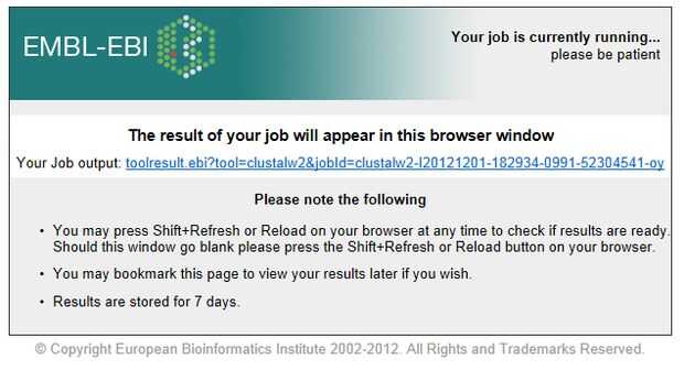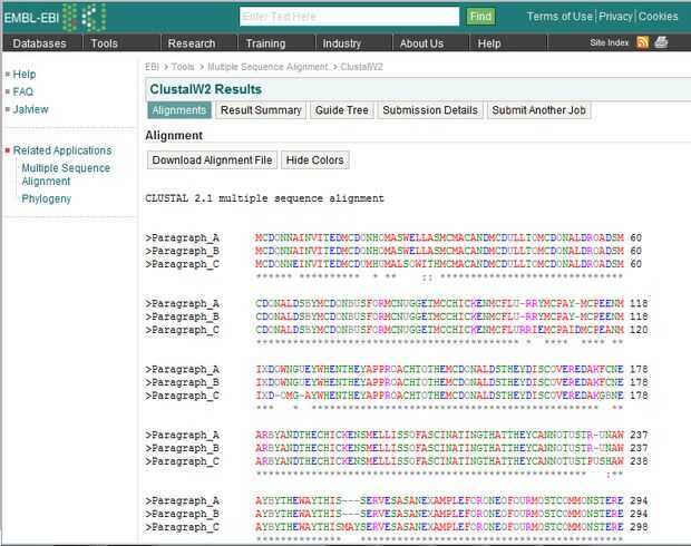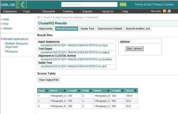 Los usuarios pueden buscar la similitud puntuaciones (%) de los párrafos involucrados después de análisis en la sección "Resumen de resultados" de la página de ClustalW resultados.