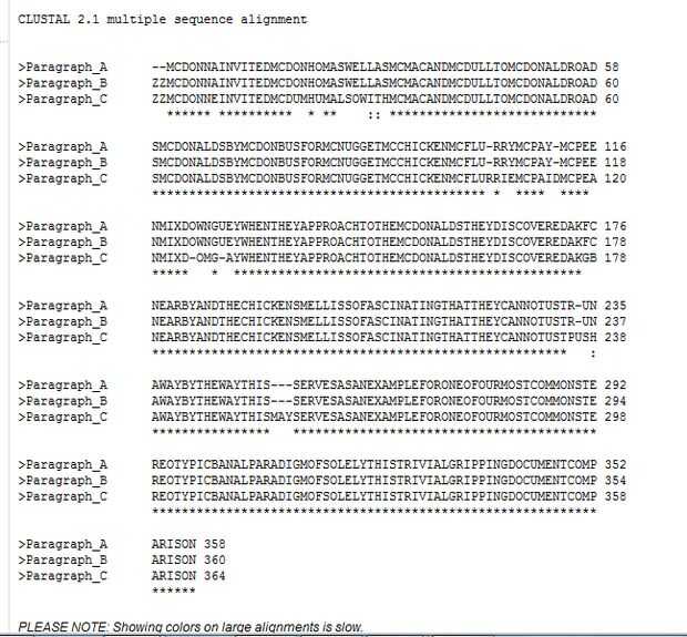Después de ejecutar el programa con los diferentes apartados con contenidos similares, por ejemplo, algunos con diferentes personajes en una frase particular mientras que otros con símbolos adicionales y espacios, la comparación de contenidos entre diferentes párrafos funcionó bien y el sistema de ClustalW reconocieron todas las diferencias de términos/Letras correctamente y con precisión. Sin embargo, todas las diferencias con respecto a los símbolos y el estado de las letras mayúsculas no estaban reconocidas. Además, algunos programas ClustalW (mundiales) no ser compatibles con el método de expediente.