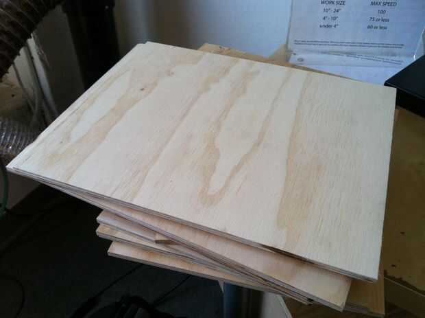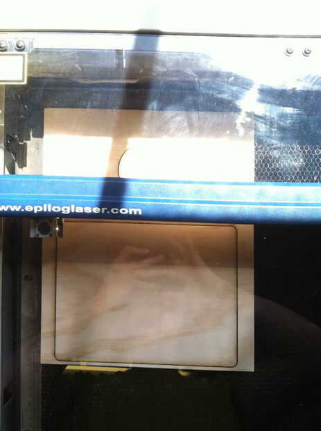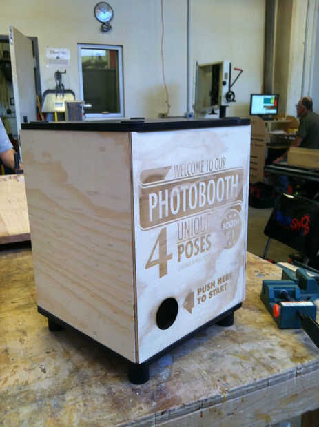 Después del corte a las dimensiones que necesitaba, el laser corte agujeros para los componentes de interfaz de tres. Añadí algo marcado en el rectángulo de círculo y iPad cámara de luz y luego al mensaje de photobooth en el tablero con la abertura para el botón de intervalómetro. El diseño del mensaje depende de usted.