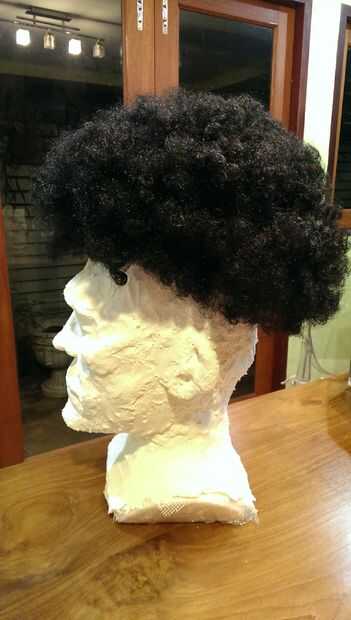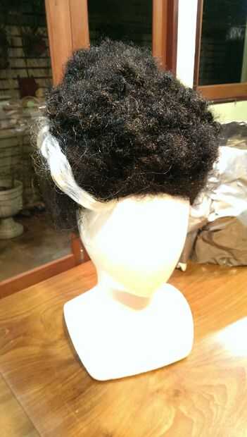 tuve dos fiestas para pelucas, uno de los cuales cosí encima del otro para conseguir la plenitud de pelo de la novia. Entonces con mis habilidades de corte de pelo de forma autodidacta, fui capaz de plasmarla en su peluca, añadiendo las dos piezas blancas laterales coser luego en.