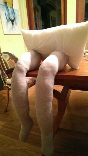 Las patas eran algunos sobre los calcetines de rodilla, rellenos de una vieja almohada poliester de relleno. Medí una longitud de alambre de floristería grueso la longitud de mi cadera a la rodilla, por lo que las piernas sería más realista y la curva de la rodilla. Me cosió a un cojín, añadido alguna cinta que podría utilizar para atar la pieza de la pierna a mi cintura debajo del vestido.