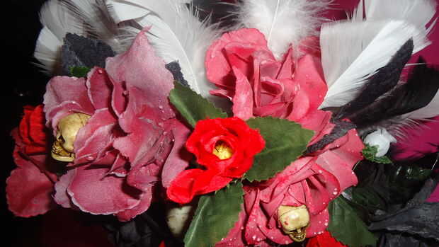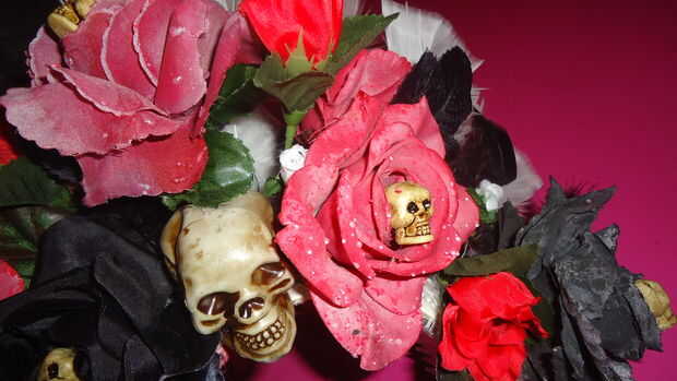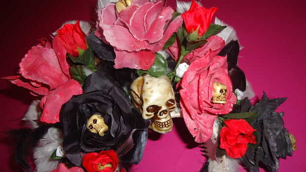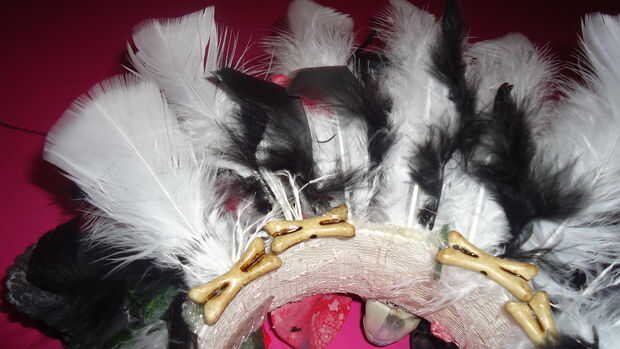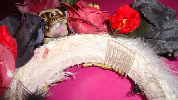 Recoger una diadema gruesa resistente, plumas, flores de plástico y cráneos... salir de la pistola de pegamento caliente y no se detienen hasta que se ve mortal suficiente para llevar a Eve boda su propio All Hallows'.