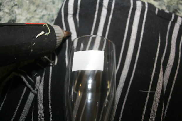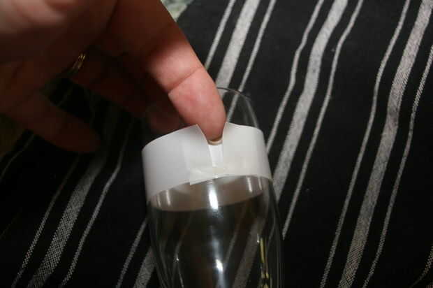 En primer lugar se tome aproximadamente una 2'' longitud de cinta blanca y con un pequeño punto de pegamento, colocar sobre el vidrio a la altura donde desea que sus novios de cuello para ser. Esta pieza la zona del cuello esconde y le da algo para pegar el resto en. Tenga en cuenta que la novia y el novio se beber de ellas.