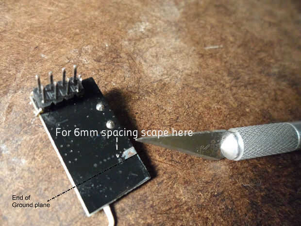 - Hacer dos cortes, 1-2 mm de ancho, de las huellas cerca de la base de la antena de PCB, como se ve en la imagen la primera imagen de arriba. Efectivamente, esto toma la antena existente del circuito.