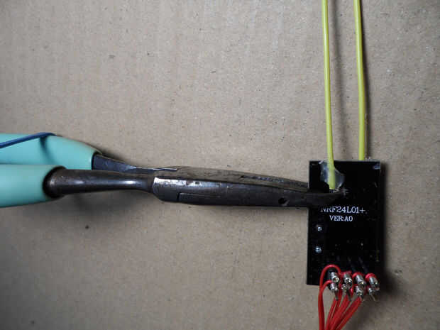 - Forman ángulo recto crujiente curvas en los cables, unos de otros, por el borde del PCB, ~ 6 mm desde donde termina el plano de tierra. Remitimos a las últimas dos imágenes de arriba. Si no se pega los cables hacia abajo, ser muy cuidadoso con no poner demasiada tensión en los puntos de soldadura.