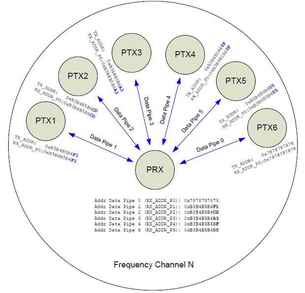 Las direcciones de tubos deben tener un patrón distinto de bytes: sólo el quinto byte es único entre todos los tubos y se conoce como el byte menos significativo (LSB). Tubo 0 independiente se asigna todos 5 bytes. Tubo 1 también asignan los cinco bytes independientemente, pero luego los primeros cuatro bytes (MSB) de tubo de 1 también se convierten en los primeros cuatro bytes de tuberías 2-5 (si existen).