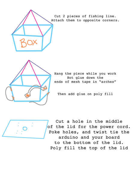 Con la tapa, colgar el recipiente a una altura cómoda para trabajar en él. Coloque la cinta de malla en arcos para ayudar a disimular la rectitud de la caja. Para ello, cortar longitudes entre cerca de 6 pulgadas y un pie, caliente pegamento un extremo, y luego el otro asegurándose de que la cinta es arquear fuera del contenedor. Crear una X con los arcos ayuda a darle más apoyo. (en la foto mi nube estaba empezando a mirar un poco square-ish de estar aplastado mientras se transporta. Pero antes era mucho buscando puffier)