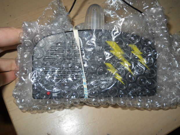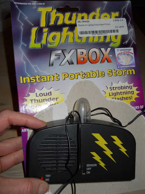 Luego conectar el juguete de la novedad de trueno en el interior superior parte de mi nube. Tiene 3 ajustes,. apagado y el sensor. Usar el sensor. Va mucho así que gire la mayoría del tiempo. Este juguete hace gran trueno sonidos y tiene una luz estroboscópica para un efecto añadido.
