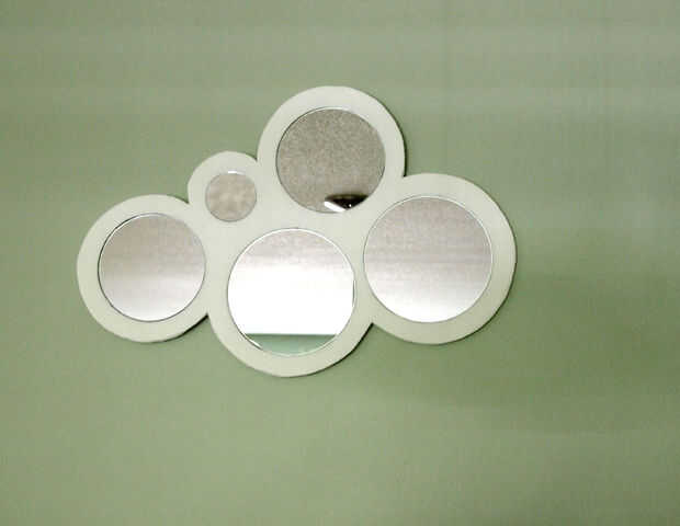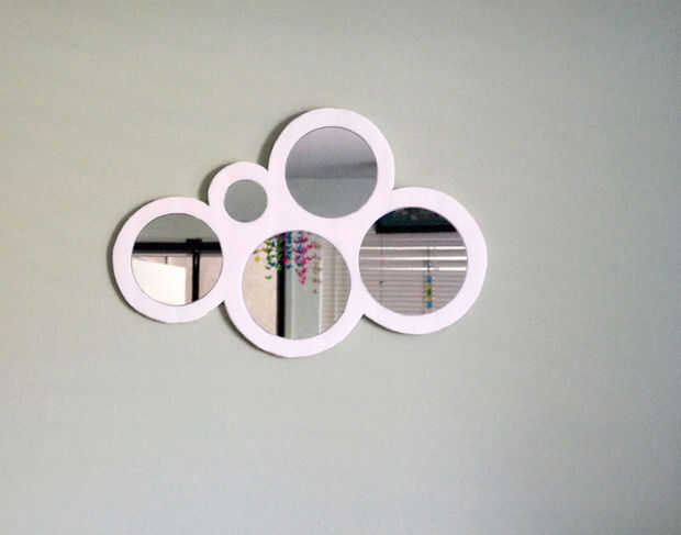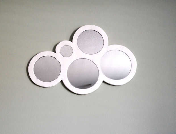Tenía un espejo de sol que había hecho colgar de una pared de mi salón que me metía un aburrido. Quería reemplazarlo por algo hice, así que hice una búsqueda en Google de "cool espejos" para conseguir un poco de inspiración. Me encontré con la hermosa burbuja espejos de Calligaris, que pensé que podía intentar replicar. Mientras se hace una plantilla para ello, creé una ligeramente diferente de la forma, que de una nube que me gustó mucho más, por lo tanto, la nube del espejo. (Parece algo apropiado reemplazar un sunburst con un espejo de nube). Mi espejo se hace a muy bajo costo usando espuma tablero y dólar tienda de espejos, bajo cuestan $10 en total. Sin embargo tenía las herramientas de espacio y energía, me gustaría haber hecho en su lugar la forma de la nube de pintura de madera blanca.