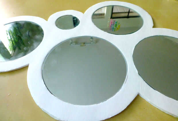 Introducir los espejos en los círculos que corte para ellos y la nube la vuelta. Pegamento en el borde de la espalda del espejo eran conocer el tablero de la espuma con la pistola encoladora. Deje que el pegamento se seque.
