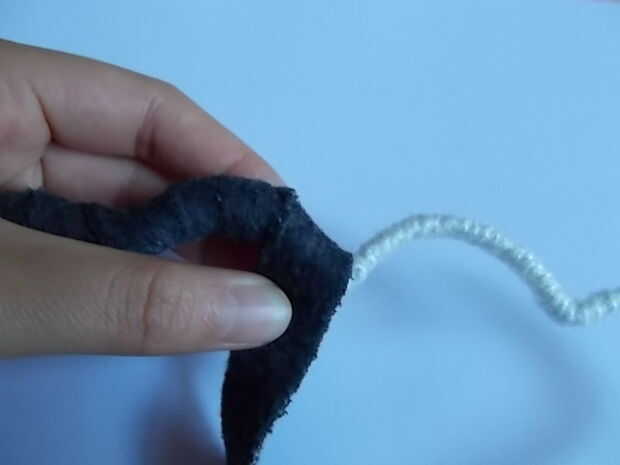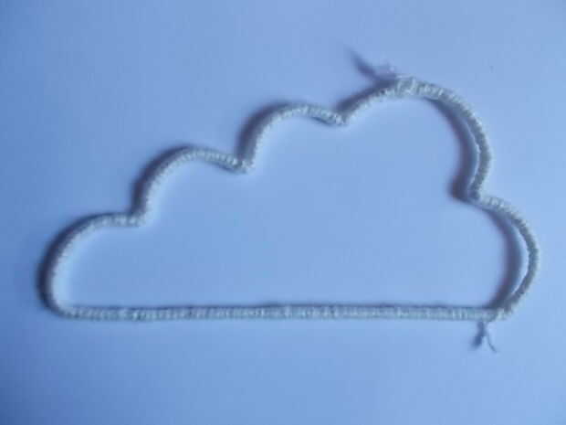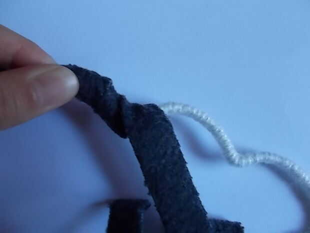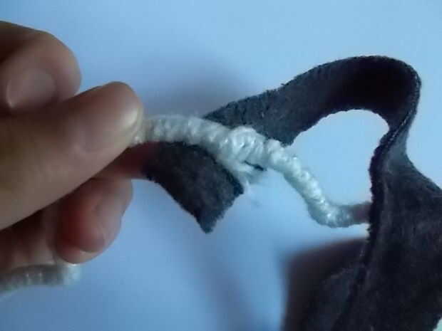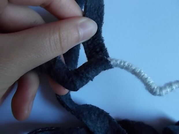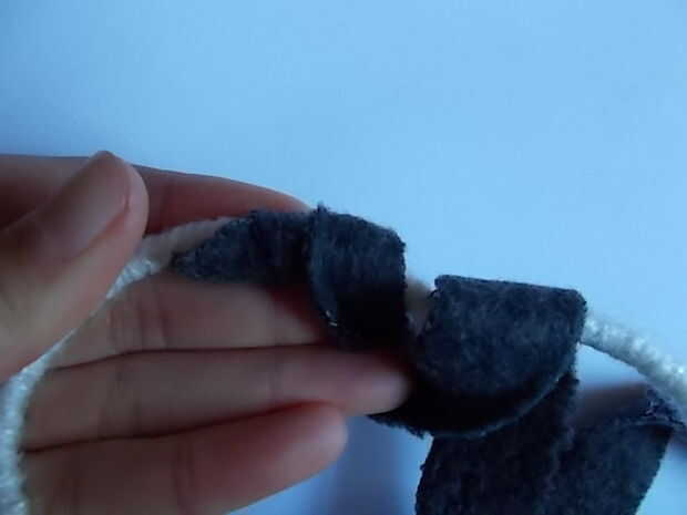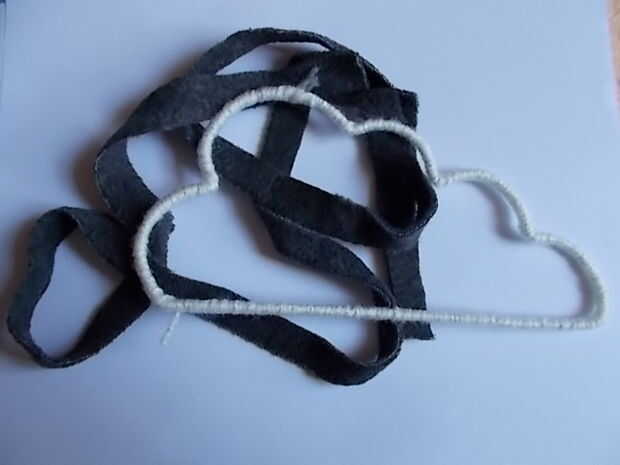 Me di cuenta que mi hilado blanco mimetizarse con las paredes blancas muy bien, pero no tenía ningún hilo gris oscuro para convertirlo en una nube de tormenta. Por suerte, mi mamá tuvo algunos carbón paño grueso y suave, así que cortar una tira larga de ella y envuelve el hilo blanco. Siga estos pasos si tienes retazos de tela a utilizar demasiado.