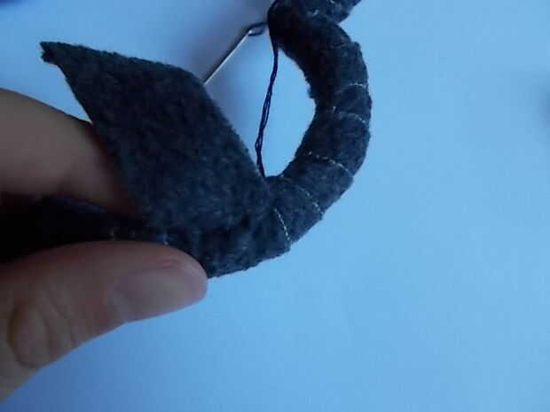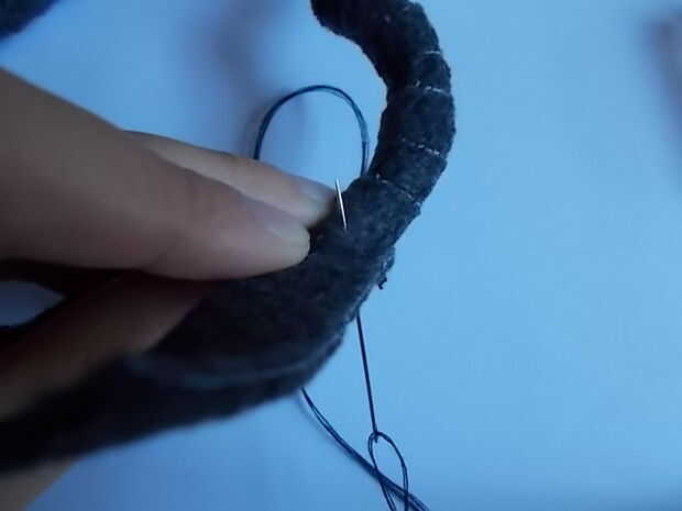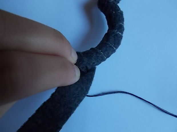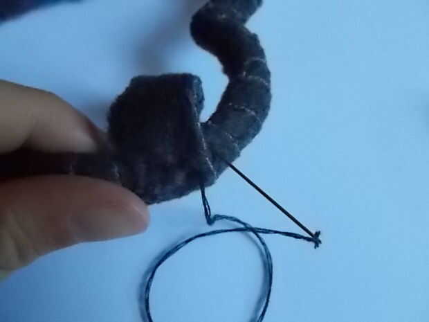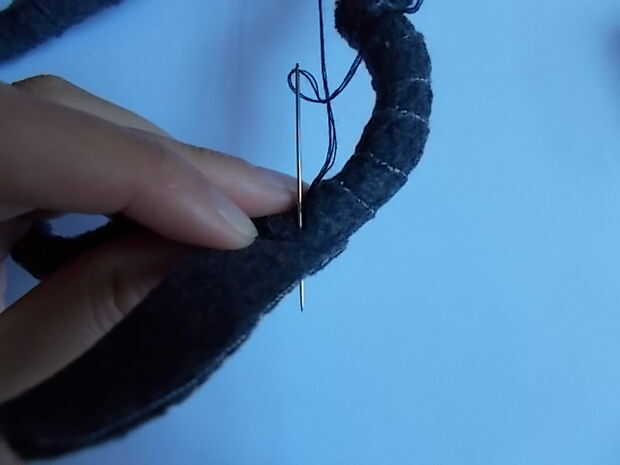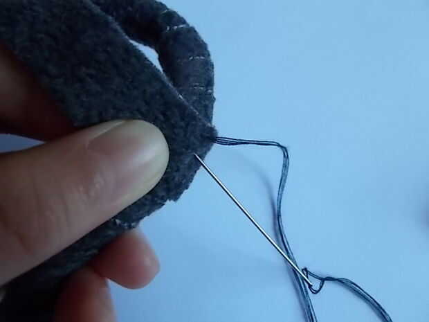 Para finalizar el ajuste, necesita coser el final. Inserte la tela detrás del extremo de la cola, la aguja y el hilo (no olvidar el nudo) y coser hasta el final, inserte la aguja de la tela detrás del extremo de la cola. Ver las fotos de esclarecimiento. Siga cosiendo a lo largo hasta que esté seguro de su seguridad antes de cortar la tela sobrante.