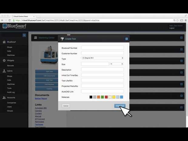 Ingrese número de seis dígitos de BlueSwarf tablero de instrumentos, si procede. Si desea asignar uno, utilice este generador de números aleatorios. Si tienes un número de la parte interna de este conjunto de herramientas, entrar en el campo de número de cliente. Tipo de herramienta seleccionar del menú desplegable. Escriba el tamaño en milímetros, decimal o fracción y unidad de medida. Introduzca la descripción de la herramienta si es necesario. Campos de desempeño se usan con las pruebas de vida de herramienta. Entrar en AutoCAD A360 enlace fichero CAD 3D o enlace FLICKR para imagen de herramienta. Reloj en códigos de color ISO material apropiado de la pieza de trabajo. Pase el cursor sobre la caja de color para ver la descripción del material. Cuando un contorno negro aparecen en el cuadro de color que se elige el material. Haga clic otra vez para quitar. Haga clic en crear para guardar.