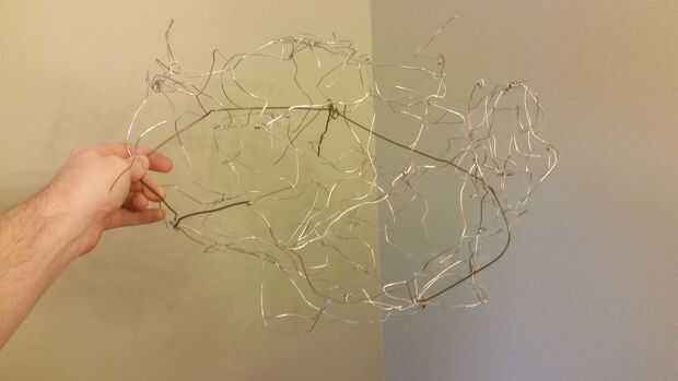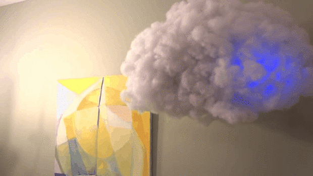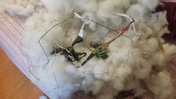Armar el perchero y el calibrado de aluminio alambre de tal manera que se asemeja a la silueta de una nube. Cosas la frambuesa Pi dentro de la unidad primero lo único que tienes que hacer es enchufarlo. Entonces, puede llenar el esquema con el relleno. Colocar la tira de LED por lo que está totalmente cubierta por la pelusa. . Una vez que hay suficiente relleno dentro del cable, simplemente "Esponjar" el relleno con el fin de ocultar el cable.