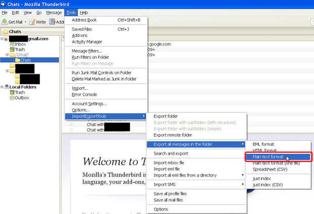En thunderbird con la carpeta "Chats" resaltados, ir a "herramientas" -> "ImportExportTools" -> "Exportar todos los mensajes de la carpeta" -> "Texto sin formato" y seleccione una carpeta para guardarlo a.