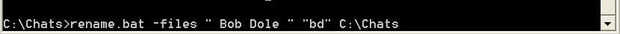 Ejecute el batch cambiar nombre del archivo para quitar espacios de nombres de archivo y acortar. Guarde el archivo "rename.bat del" en ese mismo directorio... [lo tengo aquí]. En el indicador de comandos ir a C:\Chats y escriba en: rename.bat-archivos "" '_' C:\Chats para deshacerse de los espacios. También puede reemplazar el nombre de la persona en el archivo con las iniciales para que sea más pequeño. Rename.bat-archivos "Bob Dole" "bd" C:\Chats