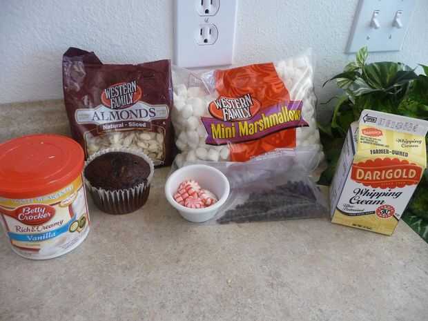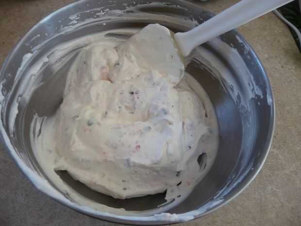 Batir la crema hasta que formen picos para batir. Doblar en las virutas de chocolate, trituradas dulces de menta y almendras molidas.