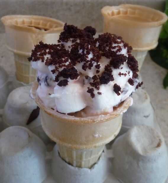 - Colocar las nubes en un cono de helado, la inmersión en las migas de la torta y congelar durante una hora o más... ~ o ~