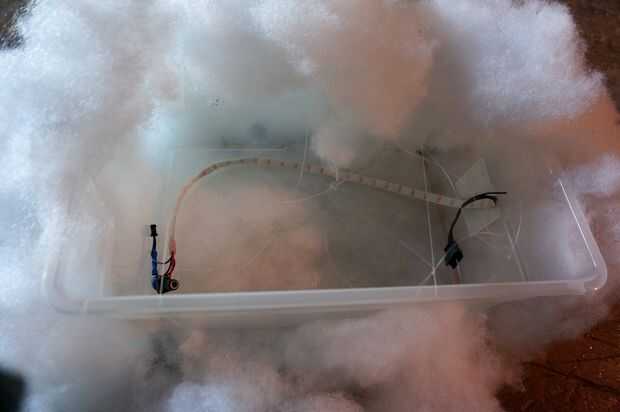 Luego, utilizando la línea de pesca, atar un par de líneas alrededor de la caja, para sostener el relleno alrededor de la caja mejor tanto para proporcionar una manera fácil de pasar las nubes.