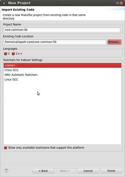 - Abierto Eclipse e importación "Código existente como Makefile Project", Seleccionar carpeta base-común-lib