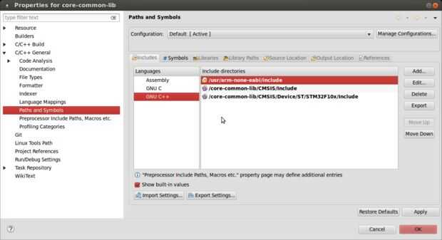 - Ir a propiedades del proyecto -> C/C++ construir y crear directorio ${workspace_loc: / base-común-lib/estructura}.