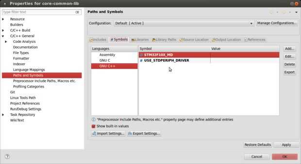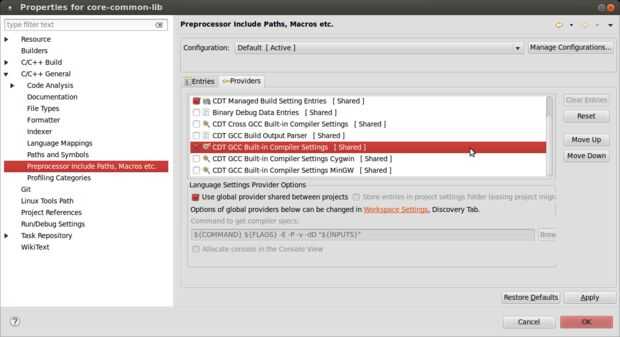 - Al General de C/C++-> Preprocessor incluyen caminos... -> proveedores y haga clic en: "GCC CDT configuración del compilador incorporado"