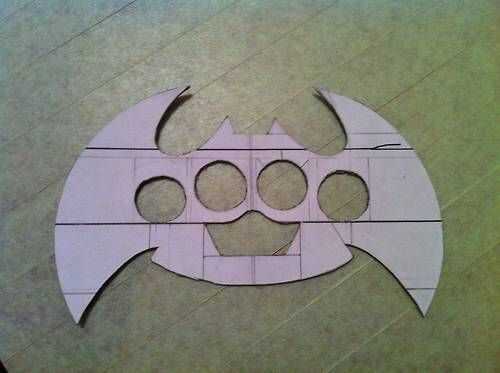 Esto es donde la creatividad brilla a través, sólo asegúrese de que dicha creatividad simétrica y cómoda para usted. Me parece que ayuda a dibujar primero la forma del plumero del nudillo, a continuación, diseñar la forma de un batarang alrededor de él. Doblar por la mitad hacia abajo en el centro para ver si su simétrico o utilizar una regla para ser precisos. Mida dos veces, corte una vez.