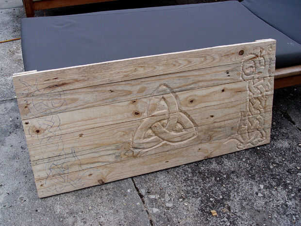 Una vez que se realizó el panel frontal, trazó el diseño que hice en el panel de papel debajo del diseño. Asegúrese de que su madera no es húmedo como el papel carbón no parece trabajar bien si lo es.