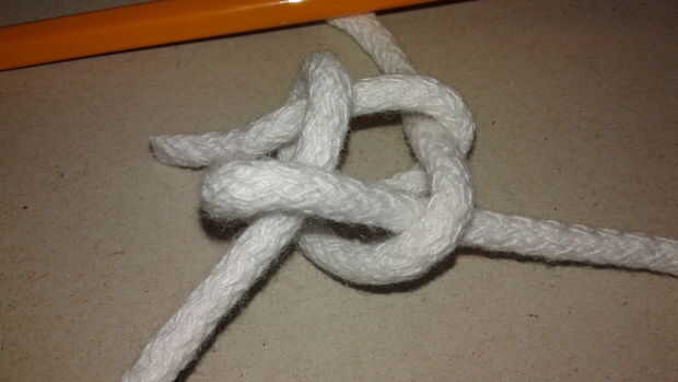 Luego tome el extremo de la cuerda derecha y ponerlo en el primer lazo que has hecho con la cuerda izquierda. (imagen 2)