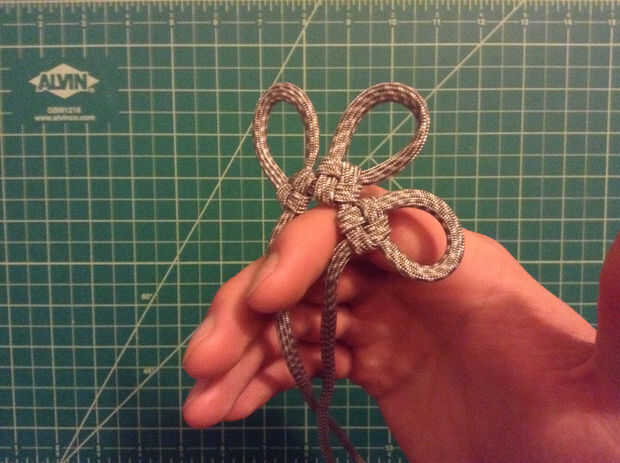 Se me ocurrió esta idea fuera de Stormdrane instructable Cruz nudo paracord lanyard, hay una cruz con el mismo nudo que parece que corrió otro pedacito del cordón por debajo de la vertical de su cruz para crear los miembros horizontales.Quería hacer