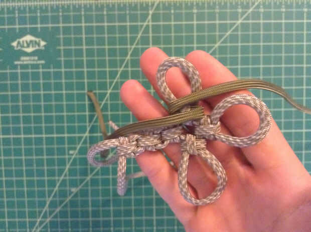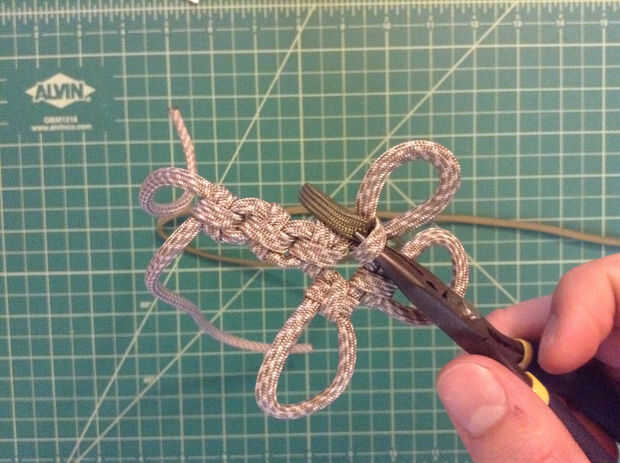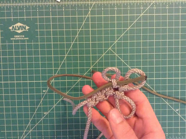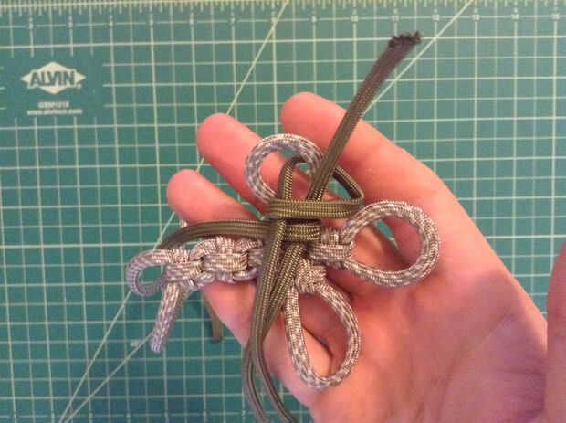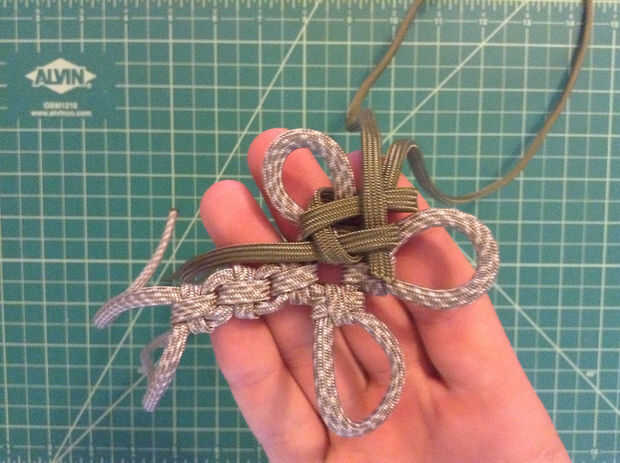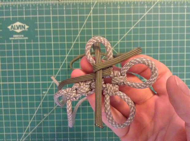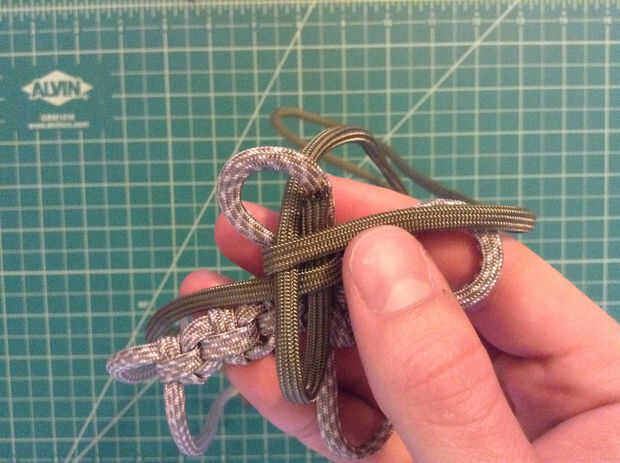 Las imágenes muestran mejor... Empiece con la parte posterior de la Cruz y el segundo color en el uso de alicates de punta. Se alimentan primero debajo de la columna vertical del primer nudo con el lazo a la izquierda. Desde aquí doblar los dos extremos para crear una forma de "S" (un espejo "Z" sería más apropiado). La porción más grande de la paracord necesita alimentarse hacia la derecha. Tire todo el lado derecho del bucle, entonces el bucle. Ir bajo, sobre y luego totalmente en el lado izquierdo de la "S" y a la parte superior. A continuación, pase sobre, entonces bajo a la derecha para completar el nudo. Apretar un poco.
