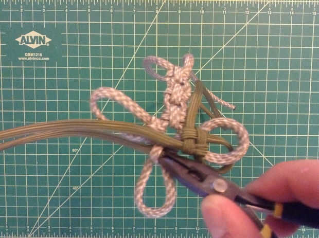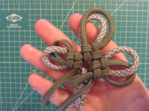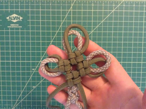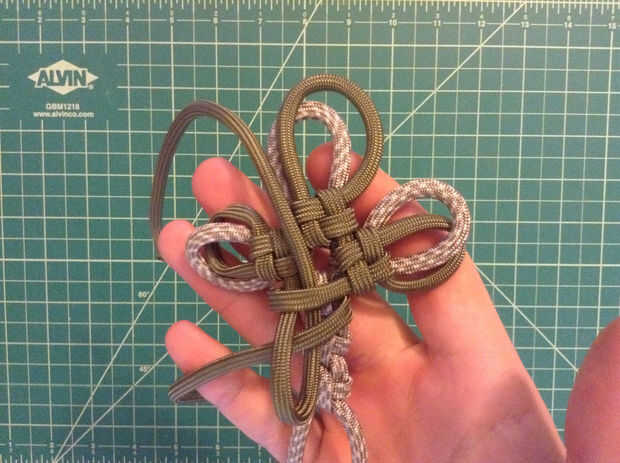 Cuando hay tres nudos terminados: tenga en cuenta que el paracord viene de la derecha se alimenta en el lado izquierdo de la columna vertical del cuarto nudo. A continuación, hacer la "S" doblando sobre, entonces siga debajo, encima, debajo de todo (excepto el spreader horizontal) y la parte superior, sobre y bajo.
