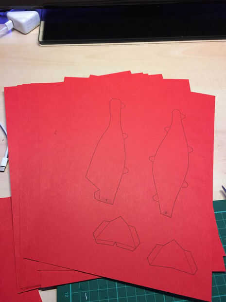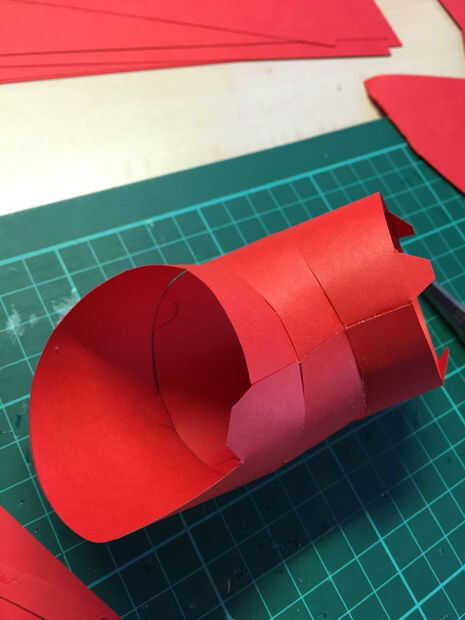 Cortaron las formas hacia fuera, rasque las líneas plegables puntos con la parte posterior de sus tijeras, en caso usted o cuadrados como estoy, con una plegadora. Unir el anillo, puede colocárselo sobre el borde de la mesa antes, luego obtiene un buen redondeo. El lado impreso está en el interior (Oh, lo dije. Pero no te preocupes, el interior se convertirá en el mismo lado cuando se termine el modelo). Doblar las aletas hacia el centro del anillo y colocar anillo de ajuste para anillo (x-1) (x). Pegar la aleta que es la más cercana la flecha primero, luego los demás. Así que asegúrese de que usted consigue las piezas alineadas correctamente (Fig. 3). Tenga cuidado de que la flecha siempre apuntan en la dirección correcta y que los pequeños bordes se alinean muy bien.
