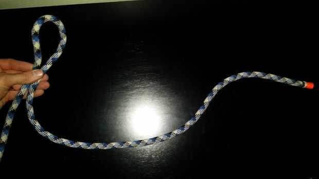 Encuentre un extremo de la cuerda de escalada y un lazo pequeño (cabeza de alien) en la cuerda. Asegúrese de que el bucle no es demasiado al final, tal vez sobre un pie y medio del final. Tome el extremo de la cuerda y colóquela sobre el bucle.