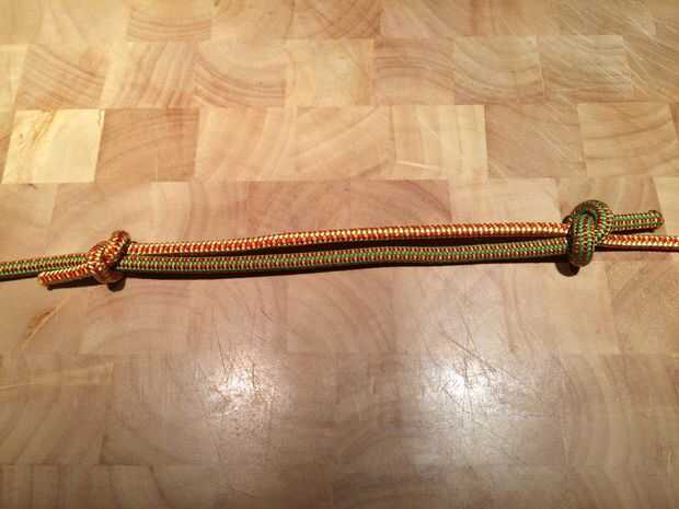 Ahora ambos nudos de rizo apretado y tirar de ambos extremos de la cuerda, los nudos deben deslizarse juntos reunidos en el centro.