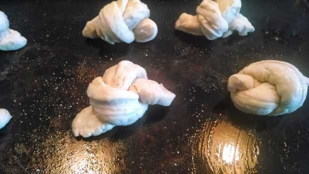 Una vez que la pasta se rueda hacia fuera cada pedazo de recogida, atar en un nudo y coloque en la bandeja de hornear engrasada. Rociar con aceite de oliva, tapa y reservar en lugar cálido hasta que han doblado su tamaño, unos 90 minutos.