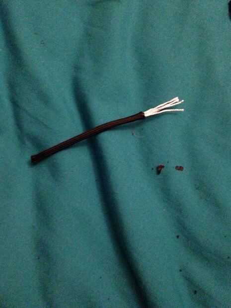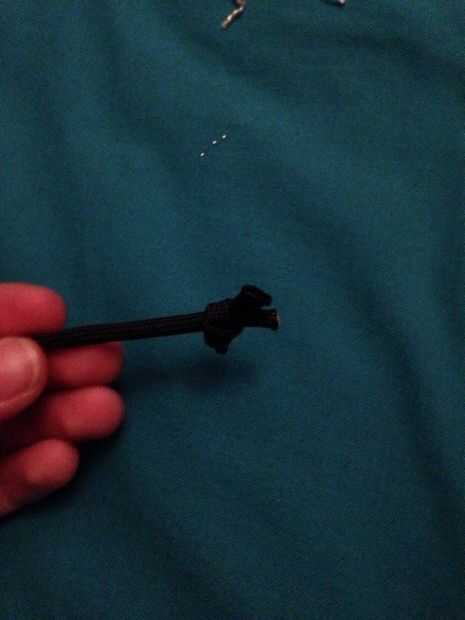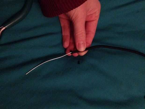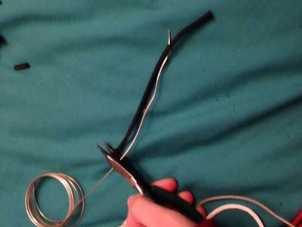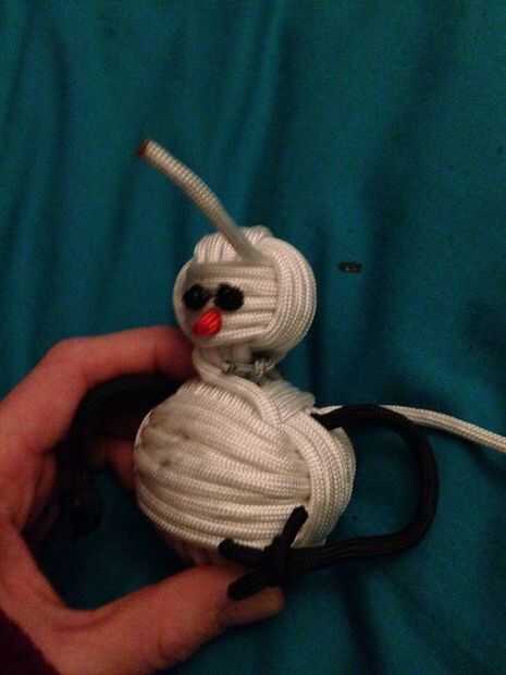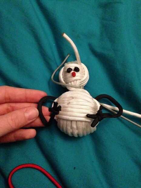 El molle negro que es de alrededor de 4 pulgadas de largo y tire hacia fuera los filamentos interiores. Cortar un trozo de alambre de la misma longitud que el paracord. Ahora, inserte el cable en el paracord. Tome un pedazo más pequeño de paracord negro y atar al final del "brazo" (con los dedos) quema un extremo de la cuerda, pegándose al cuerpo del muñeco de nieve (al igual que los ojos).