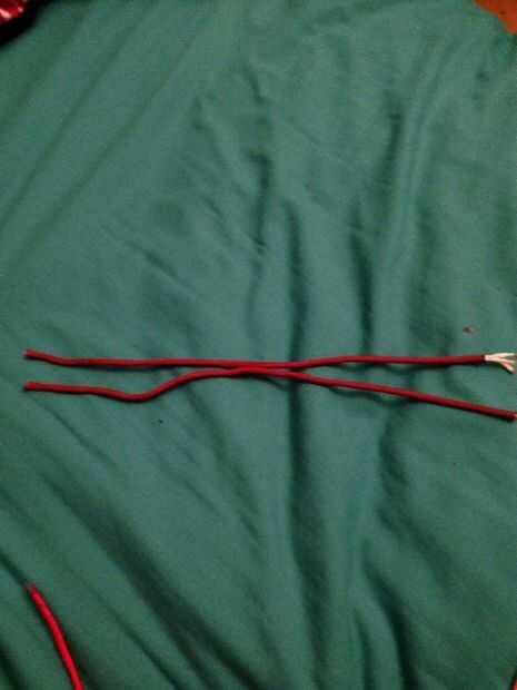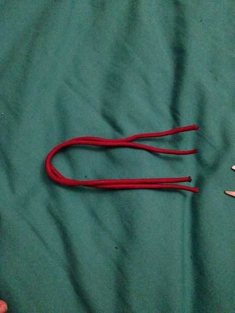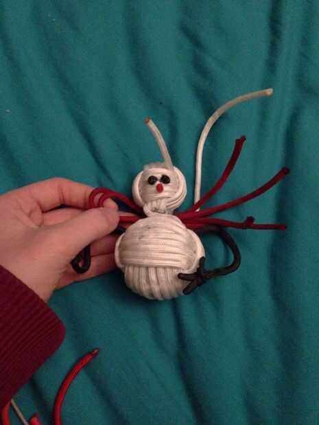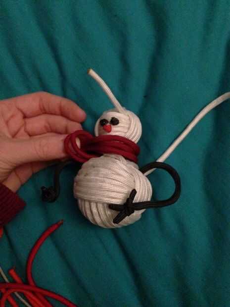 Para la bufanda, tomar pie de dos piezas largas de paracord rojo. Sacar las hebras interiores y doblar los cables por la mitad. Colóquelos detrás de la cabeza del muñeco de nieve. Llevar los extremos de los cordones alrededor de la frente y tire el por los lazos.