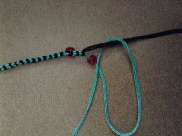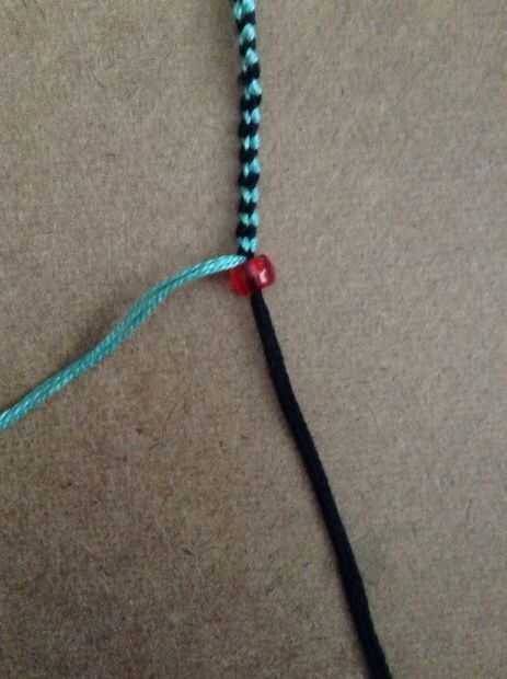 Proceed in this pattern; Añadir cuentas ensartando en un color del grupo y lo del nudo.
