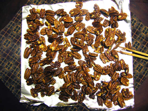 Continuar a hornear hasta que las nueces empiezan a dorarse, aproximadamente 10-14 minutos, dependiendo del horno. Las nueces hacia bastante rápidamente de marrón quemado. Ser vigilante para los últimos minutos. Cuando estén dorados, deslice con cuidado las nueces en mantel acolchado forrados con papel de aluminio para enfriar. Separe las nueces con palillos o un tenedor para que no se pegan entre sí.