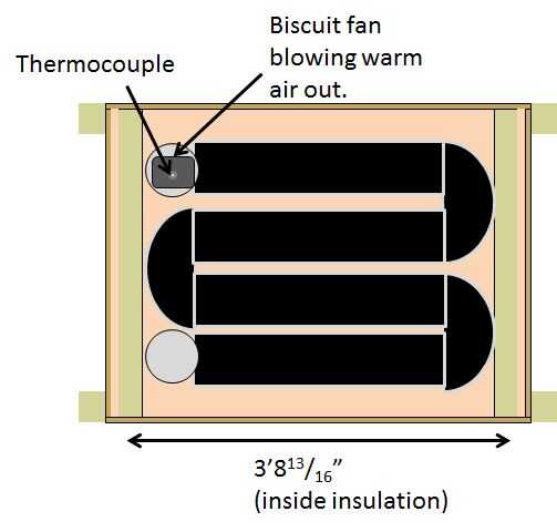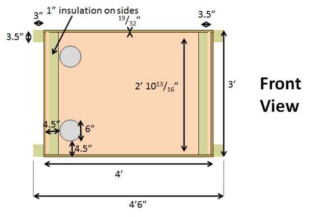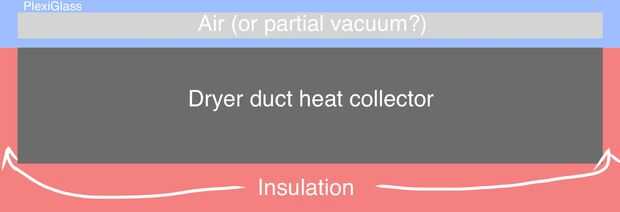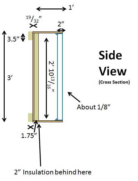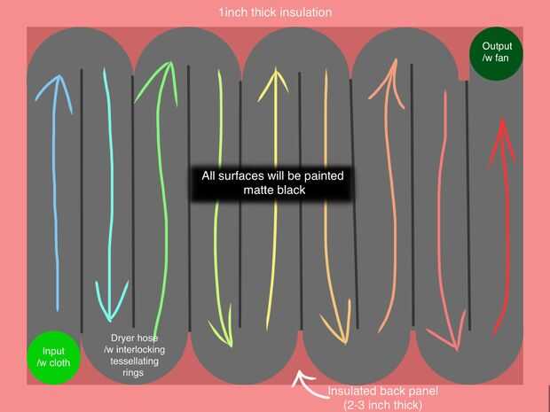 Después de experimentar un colector solar hecho profesionalmente, nos propusieron ideas ideas para nuestro propio calentador solar. Decidimos utilizar una secadora manguera enrollada en una caja de madera aislada, con un doble "glaizing" de policarbonato de Lexan, separado por una pulgada o tan de espacio aéreo. Un ventilador de ordenador de 120mm, alimentado por un panel fotovoltaico, estallaría en el edificio de la salida para extraer aire en la caja a través de la entrada de filtrado. Después de hablar con el maquinista de Creighton, elaboramos un plan de acción más preciso (mostrado abajo). Con las dimensiones solidificadas, era hora de construir.
