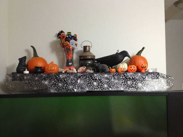 Compramos algunas calabazas pastel pequeño y decoraciones de plástico y colocar encima el televisor, extender bien con algunas velas de té con luz pilas.